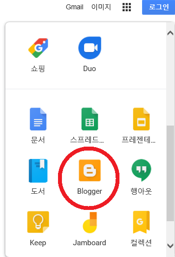 2. 구글 메인 화면 우측 탭을 보시면 ‘앱’ 아이콘이 있습니다. 거기서 Blogger을 선택해주세요.