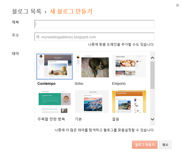 6. 제목과 주소 입력란, 테마 선택이 나옵니다. 주소는 (원하는 이름).blogspot.com입니다.