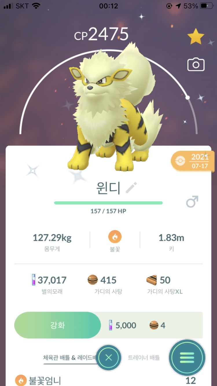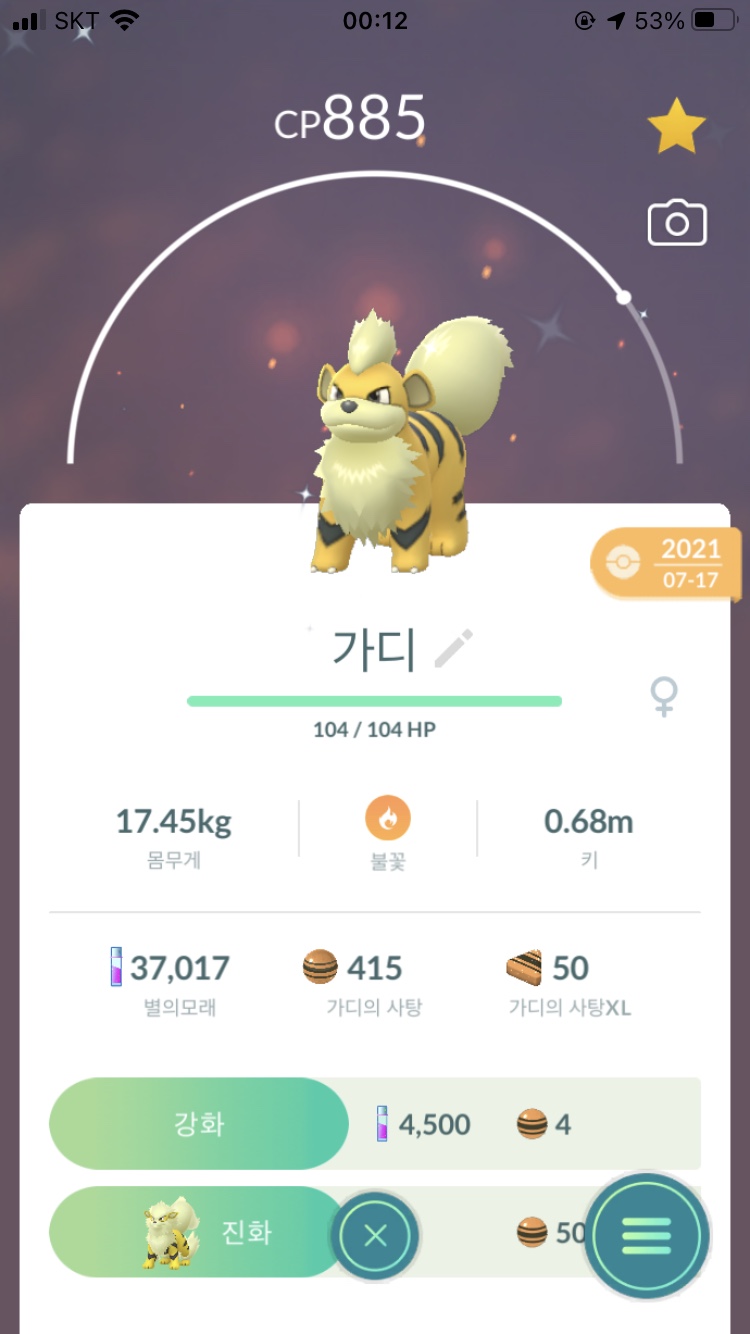 오늘의 포켓몬스터는 바로 강아지 포켓몬스터 가디입니다.