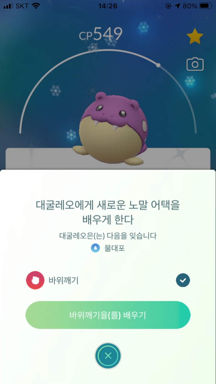 - 노말 어택 : 물대포(물), 눈싸라기(얼음)
