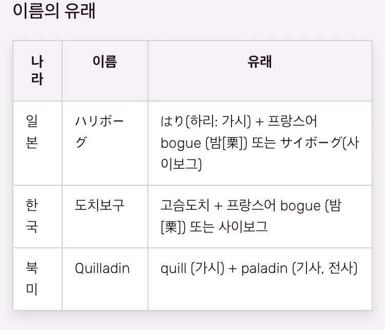 - 이름 유래 : 도치보구 = 고슴도치 + 밤 or 사이보그