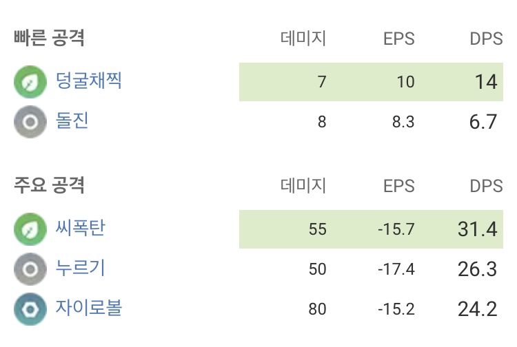 - 노말 기술 : 덩굴채찍(풀), 돌진(노말)
