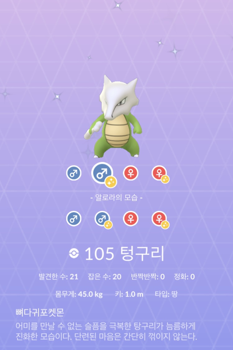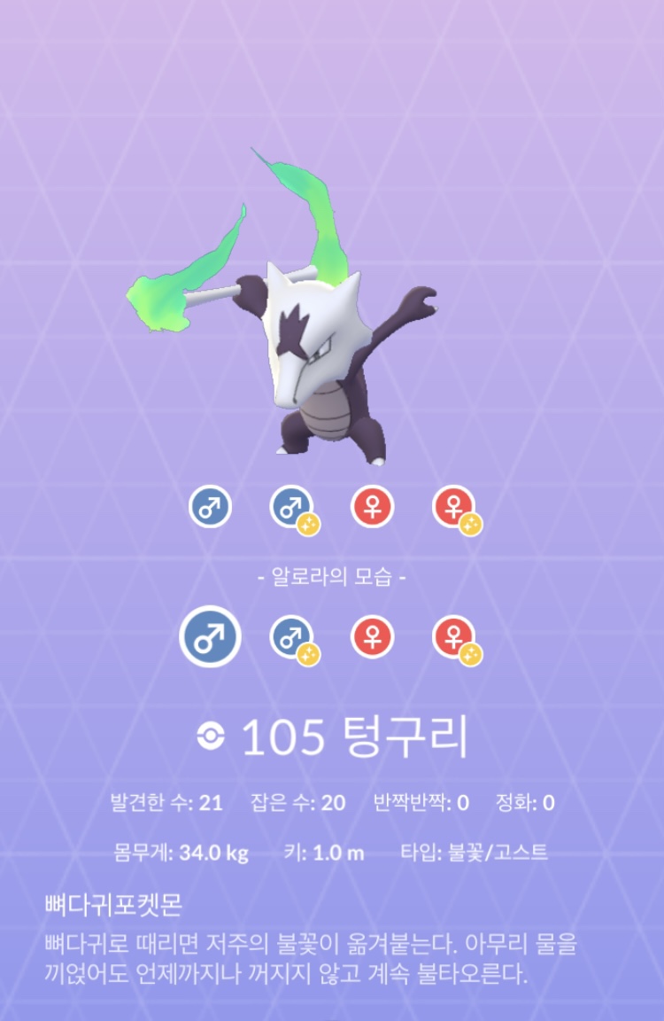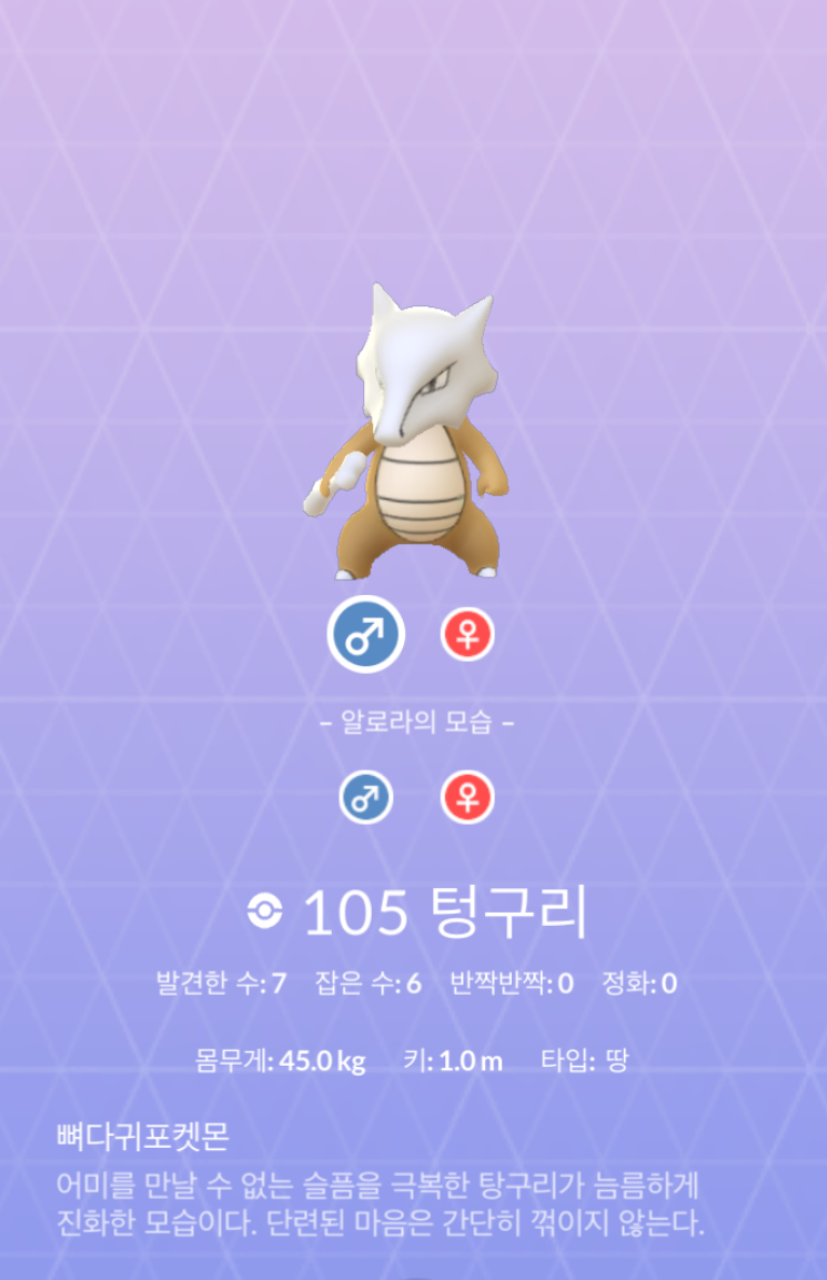 - 특성 : 어미를 만날 수 없는 슬픔을 극복한 탕구리가 늠름하게 진화한 모습이다. 단련된 마음은 간단히 꺾이지 않는다.
