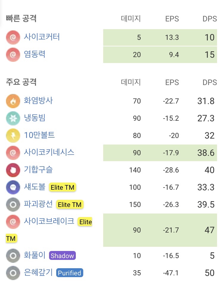 10만볼트(전기), 기합구슬(격투), 섀도볼(고스트), 파괴광선(노말)