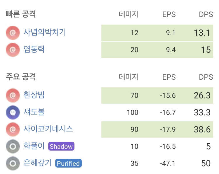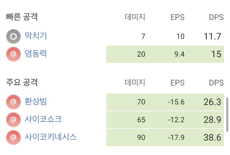 - 노말 어택 : 막치기(노말), 염동력(에스퍼)