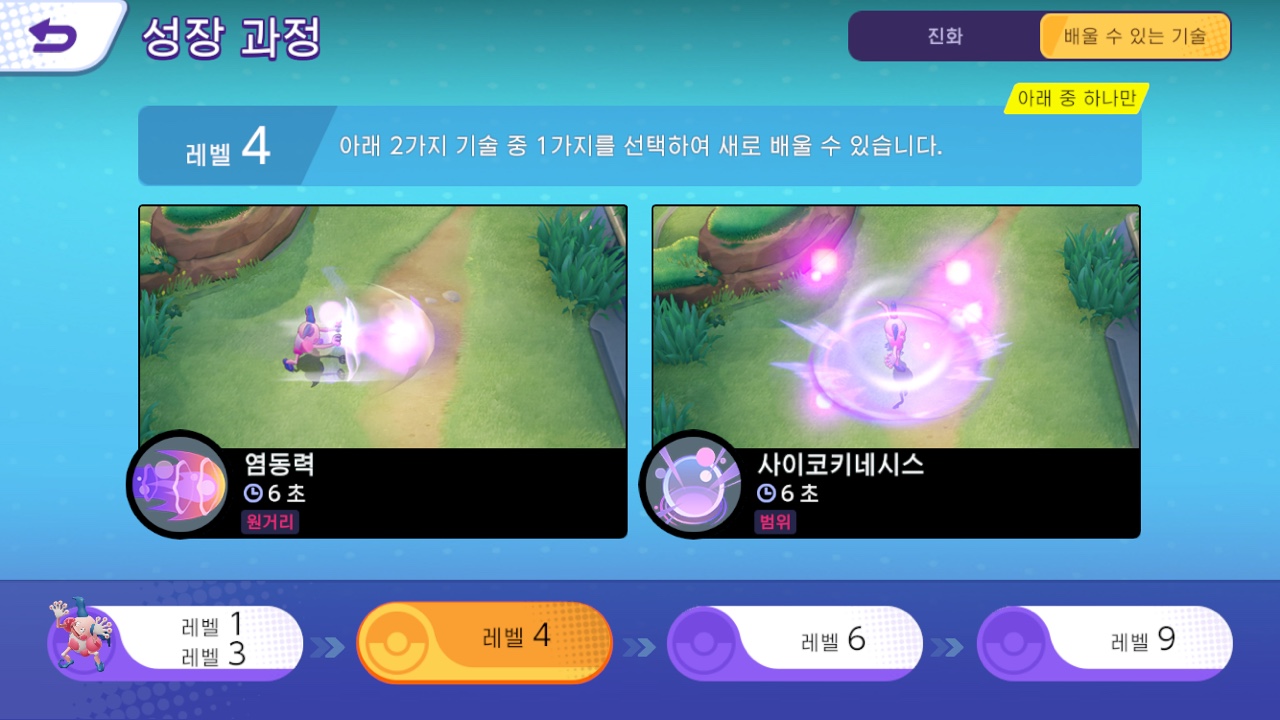 <레벨4>: 아래 2가지 기술 중 1가지를 선택하여 새로 배울 수 있습니다.