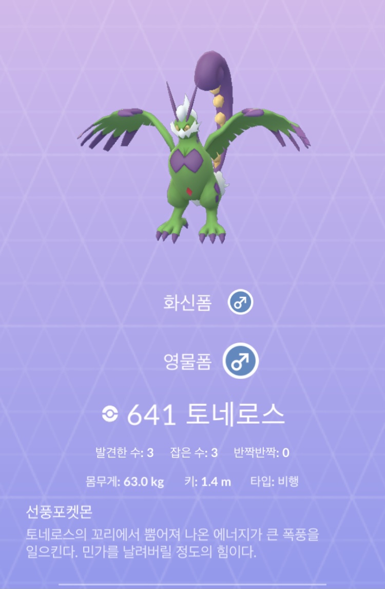 이번 포켓몬은 화신폼과 영물폼이 있는 토네로스입니다.
