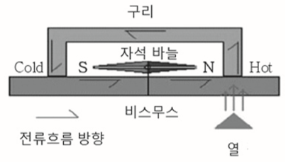 이 센서의 원리는 1821년 독일 물리학자인 제베크가 비스무스(Bi)와 구리(Cu)를 이용하여 연결된 선에서 온도에 따라 전압이 발생하는 것을 발견하였다. 이런 현상을 발견자의 이름을 따서 제베크 효과라고 부른다. 제베크가 당시 열전효과를 실험한 개념도를 보자.
