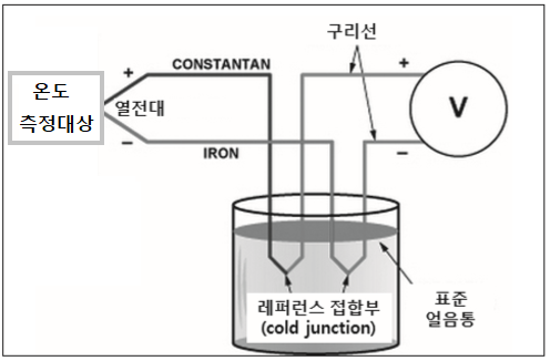 서모커플의 기전력을 전압계로 바로 측정할 수는 없다. 왜냐하면 전압계의 단자와 서모커플의 단자 사이에서 또 다른 기전력이 유발되기 때문이다. 그리고 전압계로 기전력을 알아도 저온접점의 온도를 알 수 없고 변화할 가능성이 있다. 그래서 저온 접점을 0℃인 얼음 속에 넣어두게 되면, 고온 접점의 온도를 측정할 수 있게 된다. 이렇게 되면 전압계에서 읽게 되는 전압과 계수를 이용하여 Vs=a*△T=a*(T2-T1)=a*T2, 미지수 T2를 알 수 있게 된다.