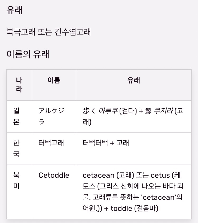 - 특성 : 먼 옛날에 바다에서 올라와 육지에 살게 되었다. 고래왕자의 근연종이라고 한다.