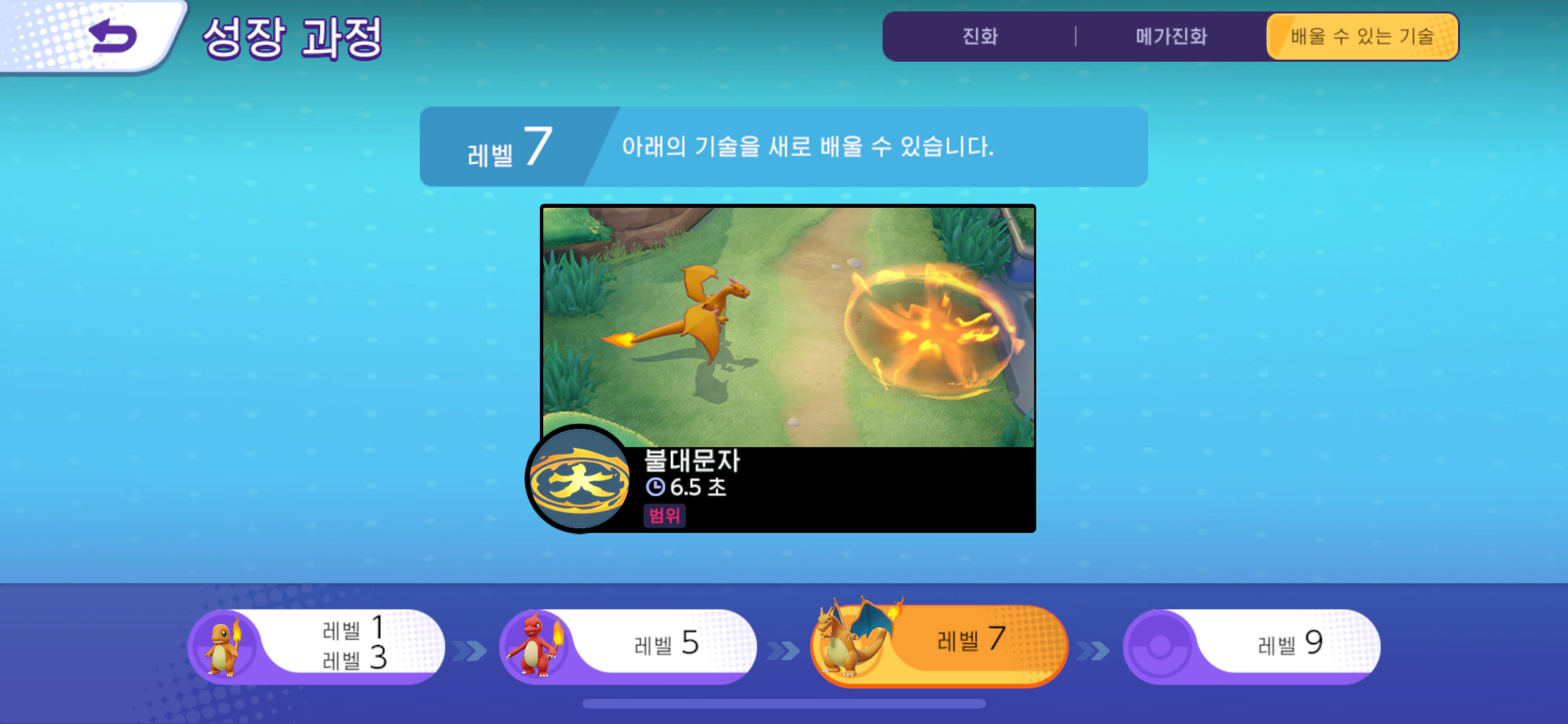 <레벨7> : 일반 리자몽 캐릭터는 2가지 중 1가지를 배울 수 있지만, 메가리자몽Y는 1가지만 배울 수 있다.