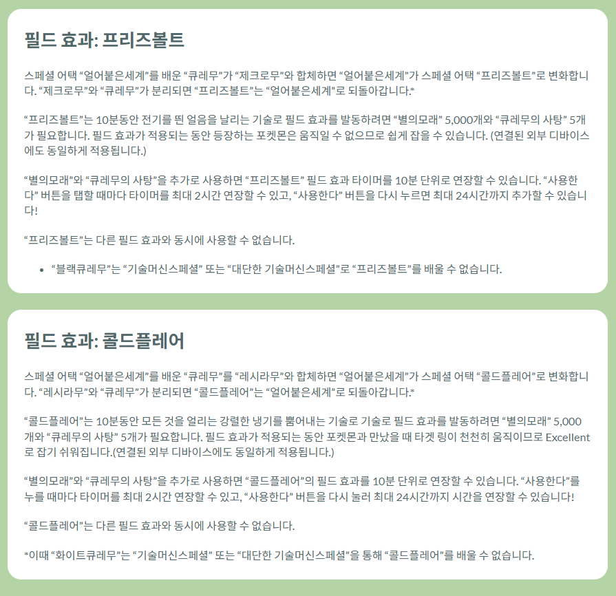 “별의모래”와 “큐레무의 사탕”을 추가로 사용하면 “프리즈볼트” 필드 효과 타이머를 10분 단위로 연장할 수 있습니다. “사용한다” 버튼을 탭할 때마다 타이머를 최대 2시간 연장할 수 있고, “사용한다” 버튼을 다시 누르면 최대 24시간까지 추가할 수 있습니다!
