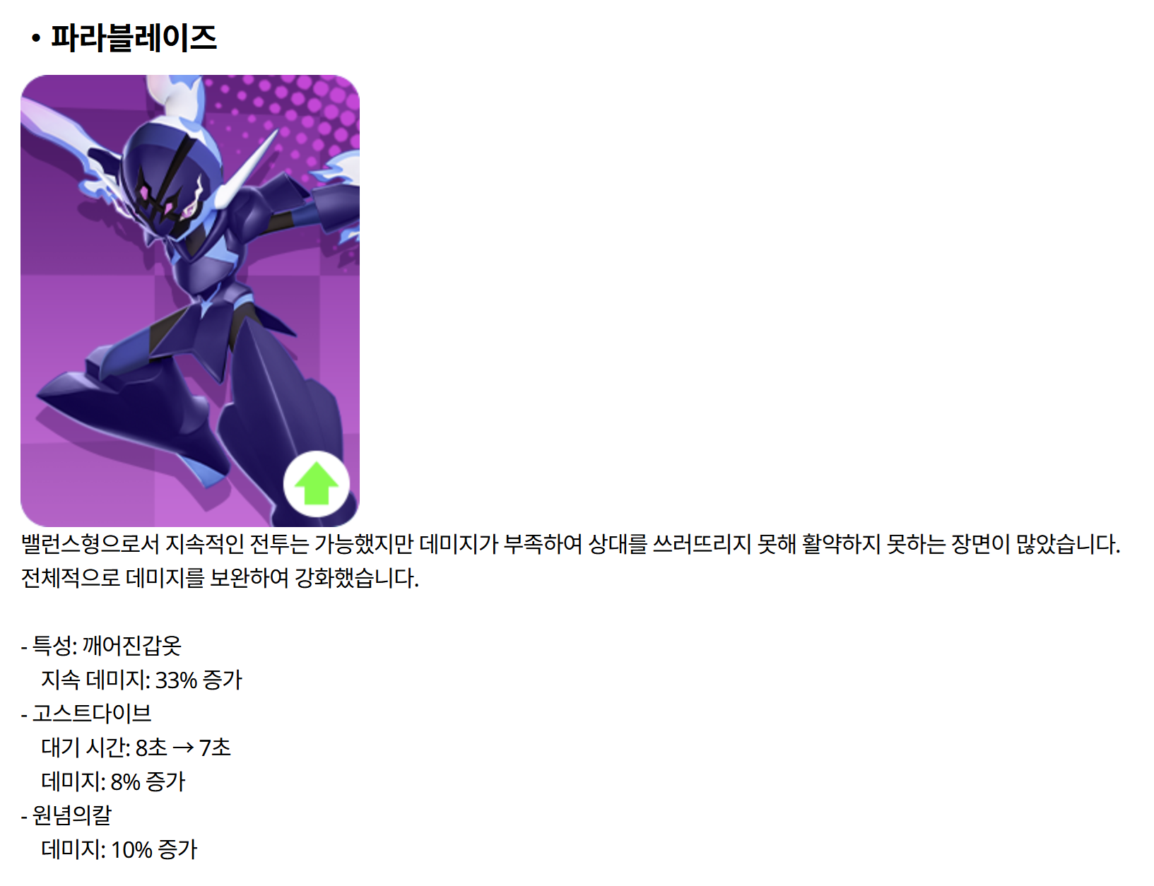 밸런스 조정으로 가장 쓸만해진 캐릭터는 다크라이, 파라블레이즈 인 것 같습니다.