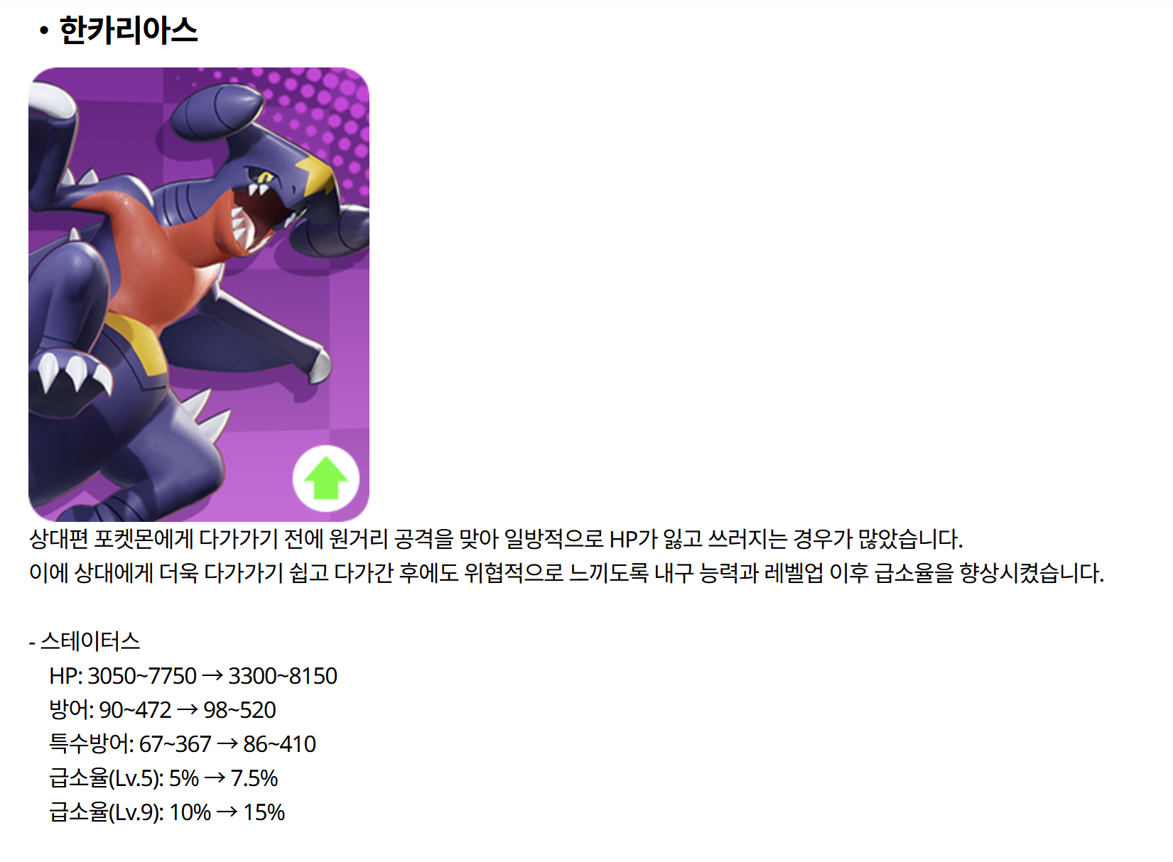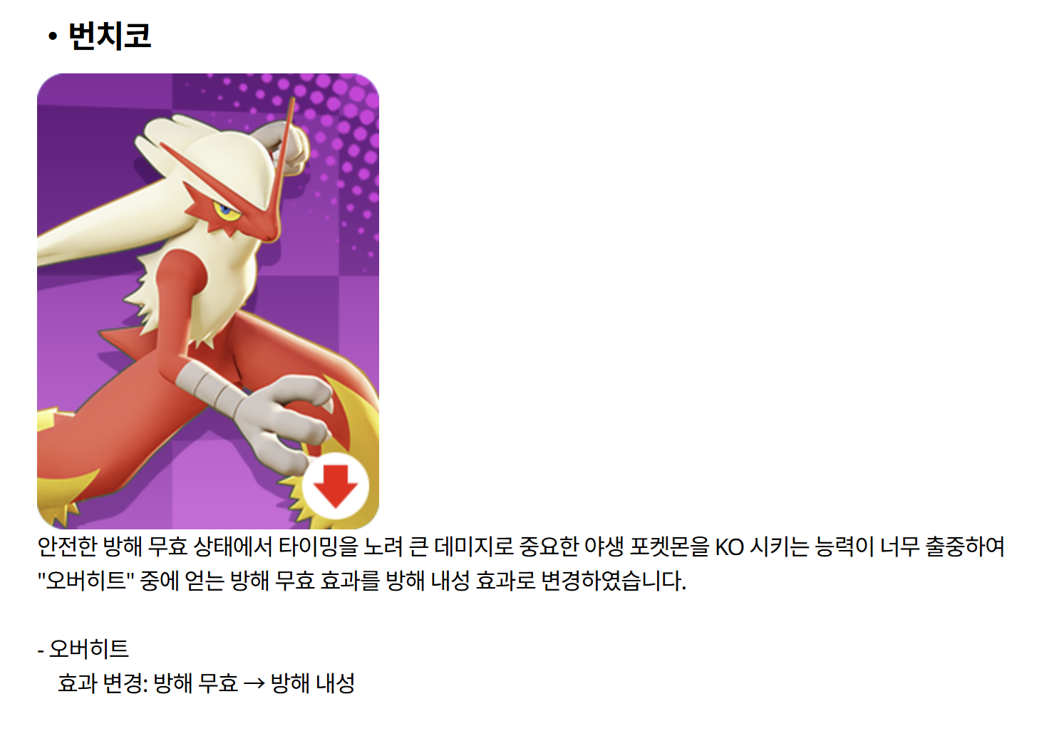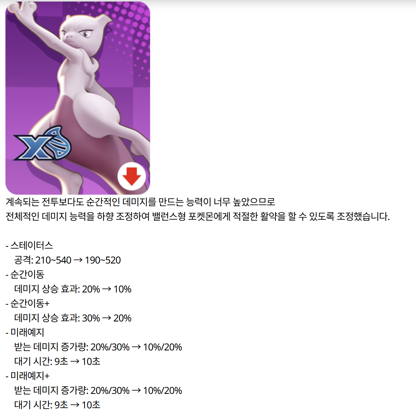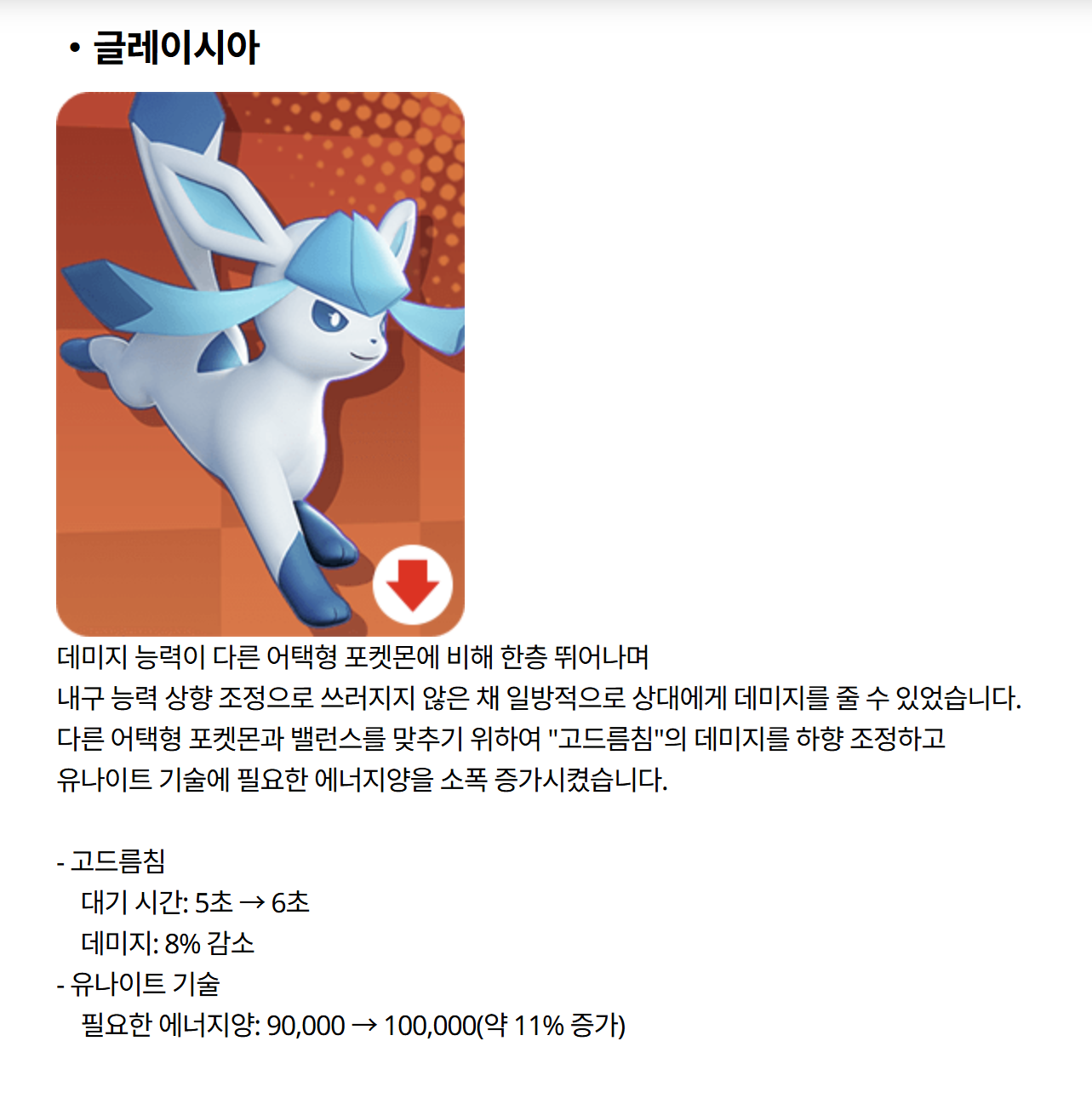 전체적인 데미지 능력을 하향 조정하여 밸런스형 포켓몬에게 적절한 활약을 할 수 있도록 조정했습니다.