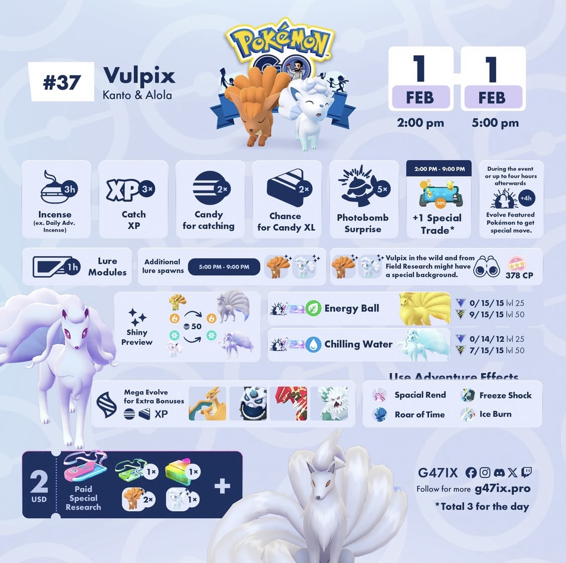 2월 “커뮤니티 데이” 테마의 필드리서치를 진행할 수 있습니다! “식스테일”과 “식스테일(알로라의 모습)”을 잡고 “별의모래”, “하이퍼볼”, “식스테일” 또는 “식스테일(알로라의 모습)”과의 추가 만남 등의 리워드를 받으세요! 운이 좋으면 스페셜 배경이 있는 “식스테일” 또는 “식스테일(알로라의 모습)”이 등장하는 필드리서치를 받을 수도 있습니다!