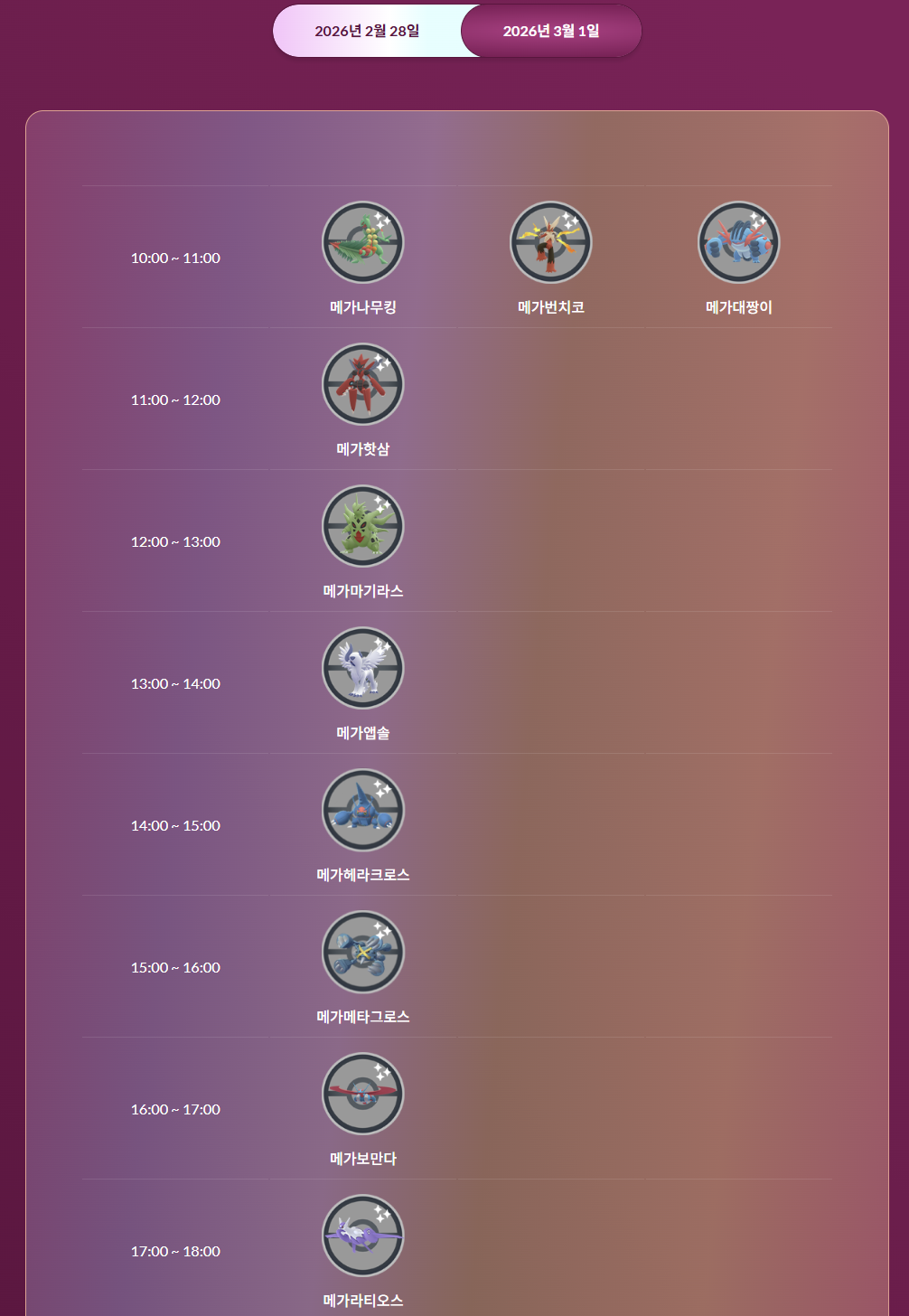 - 메가 레이드 배틀(3월 1일) : 메가나무킹, 메가번치코, 메가대짱이, 메가핫삼, 메가마기라스, 메가앱솔, 메가헤라크로스, 메가메타그로스, 메가보만다, 메가라티오스