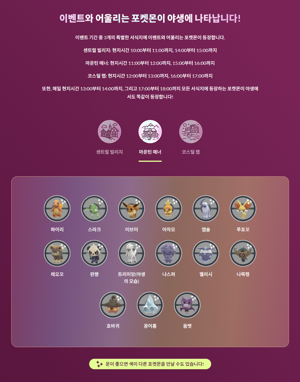- 센트럴 빌리지(10시~11시, 14시~15시) : 이상해씨, 구구, 이브이, 나무지기, 랄토스, 도치마론, 파르빗, 화살꼬빈, 메이클, 트리미앙, 슈쁘, 나룸퍼프, 목도리키텔, 데덴네, 음뱃