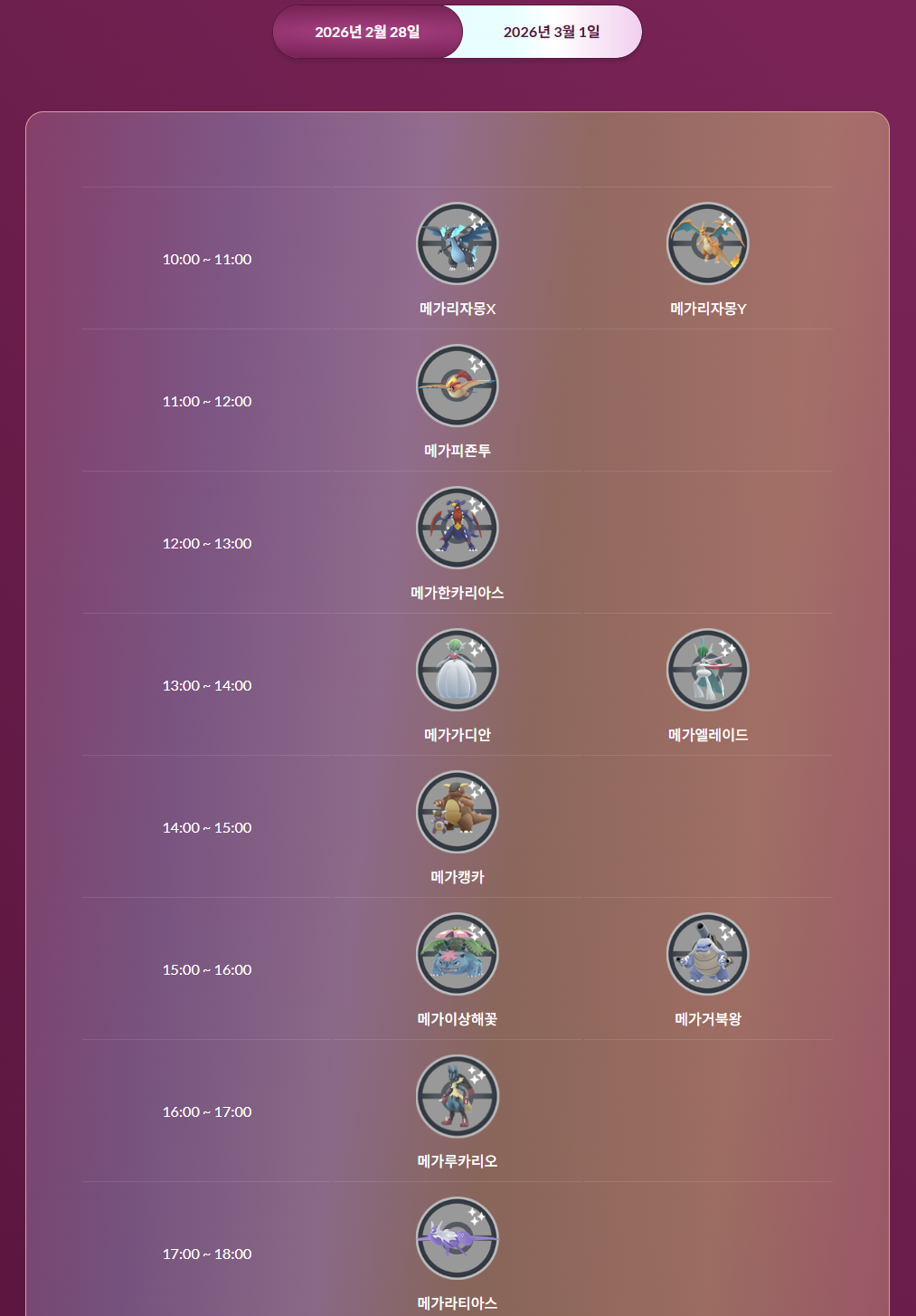 - 메가 레이드 배틀(2월 28일) : 메가맂몽X,Y, 메가피죤투, 메가한카리아스, 메가가디안, 메가엘레이드, 메가캥카, 메가이상해꽃, 메가거북왕, 메가라티아스