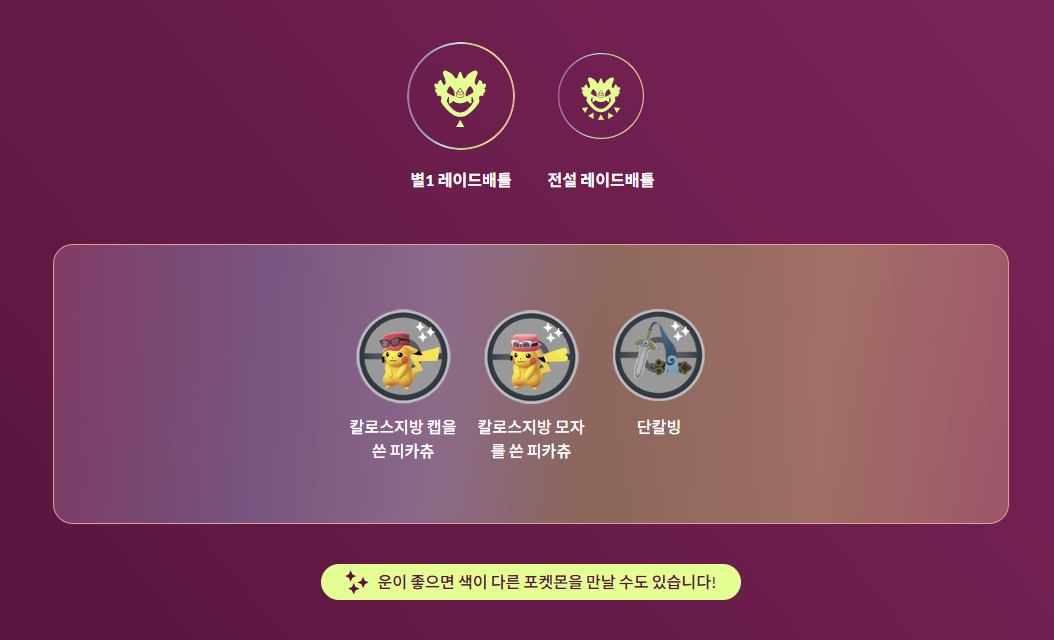 - 별1 레이드배 : 칼로스지방 캡을 쓴 피카츄, 칼로스지방 모자를 쓴 피카츄, 단칼빙