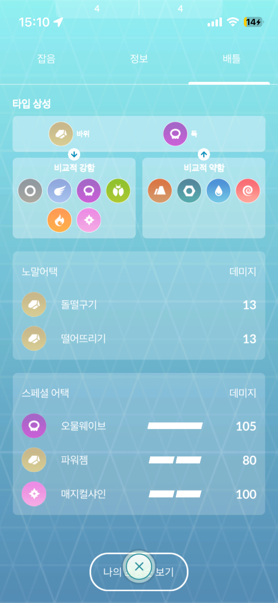 - 비교적 강함 : 노말, 비행, 독, 벌레, 불꽃, 페어리