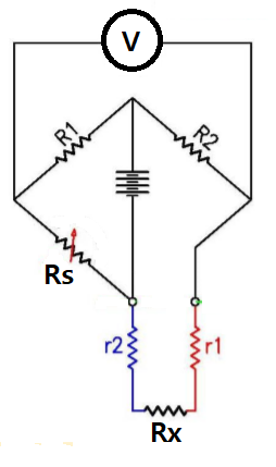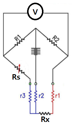 그림에서 미지의 저항 Rx를 측정하기 위하여 저항 R1,R2의 비를 같게 한 후 검류계 G가 0을 지시할 때까지 Rs를 조절한다. 즉, 전위차가 0 V일 때 검류계는 0을 지시하고 이때에 브릿지가 평형이 되었다고 한다. 다음의 식으로부터 Rx를 유도할 수 있다.
