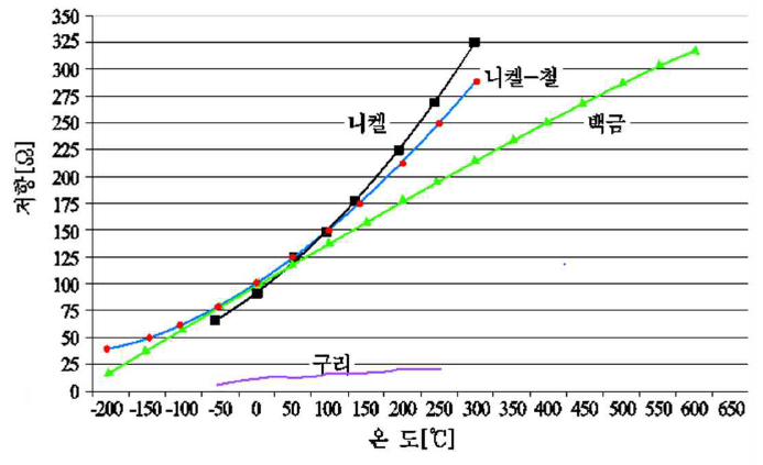 그림은 각종 금속의 온도에 따른 저항의 관계를 나타낸 것이다. 이를 일반적인 관계식으로 표현하면, 온도t(℃)에서 금속의 전기저항 Rt(Ω)은 다음과 같다. 그리고 b,c는 계산과정에서 너무 작은 값이라 제외하고, 선형적인 구간(0℃ ~ T℃)으로 제한한다면 간단한 식이 나온다.